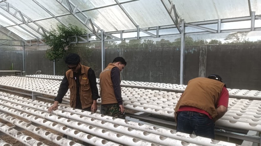 Tahap pelaksanaan dimulai dengan proses penyemaian bibit selada pada media spons yang telah dibasahi. Bibit didiamkan selama satu hari hingga muncul tunas. Selanjutnya, bibit yang telah berkecambah dipindahkan ke pipa hidroponik di dalam greenhouse. Selama masa pertumbuhan, dilakukan perawatan rutin meliputi pemberian nutrisi, pengecekan aliran air, serta pemantauan kondisi lingkungan.